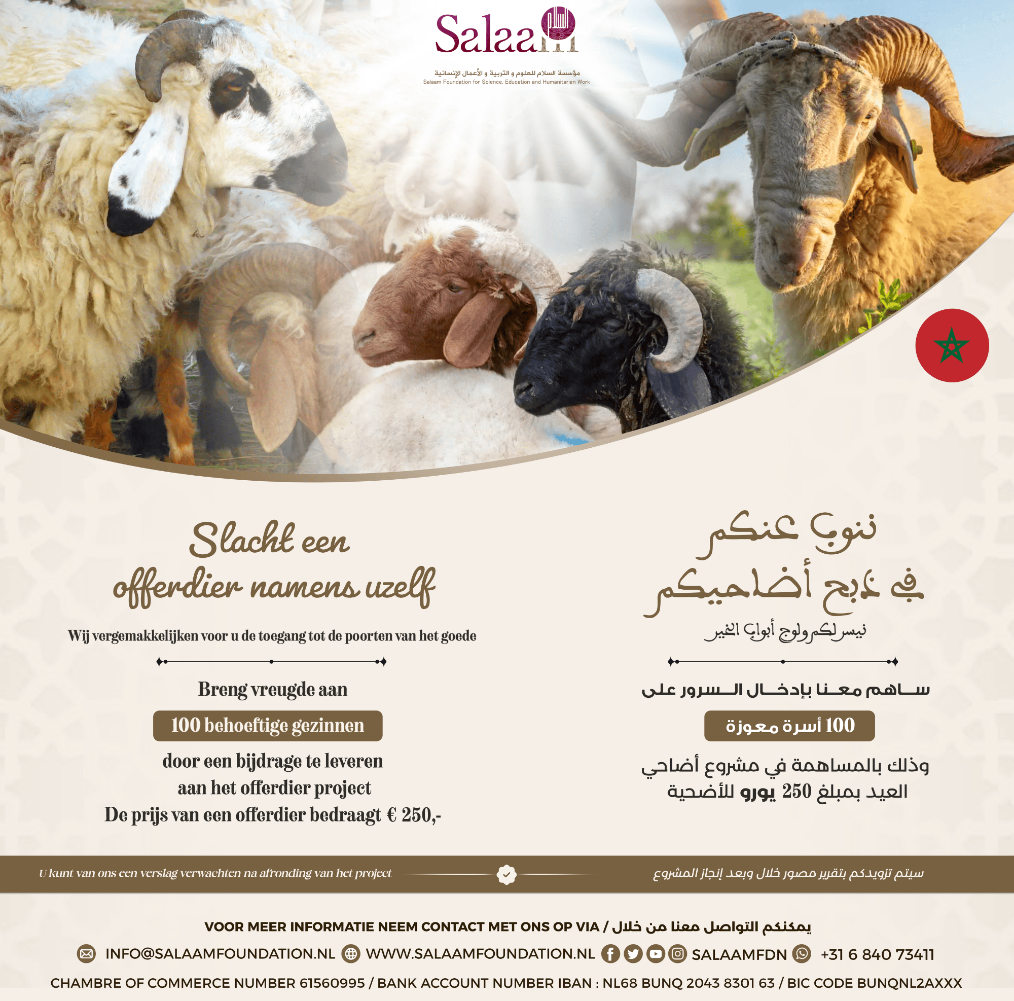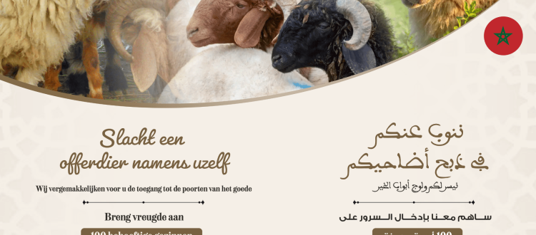 Zoek toenadering tot Allah door een offerdier namens jezelf te slachten én tegelijkertijd je offer aan een behoeftig gezin te schenken. Met ons jaarlijkse offerdierenproject bundelen de organisatie en haar toegewijde vrijwilligers hun krachten om gezinnen in Marokko, die onder de armoedegrens leven, van een offerdier te voorzien. Dankzij de vrijgevigheid van onze donateurs kunnen deze gezinnen de vreugde en blijdschap van het offerfeest ervaren, terwijl jij jezelf spiritueel dichter bij Allah brengt door aan dit mooie initiatief deel te nemen.